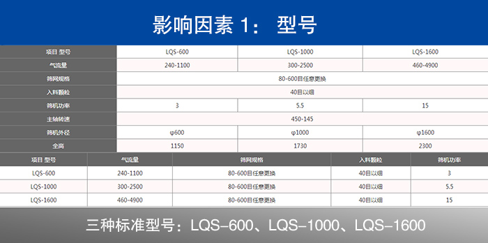 碳化鎢粉氣流篩分機的型號有LQS-600、LQS-1000、LQS-1600等3種標準型號,價格間的差異是根據篩分機外形大小決定,外形越大的碳化鎢粉氣流篩分機產量也就會越大,所以他們之間的價格聯系就是產量越大型號就越大,大型號的碳化鎢粉氣流篩分機價格就會越高。