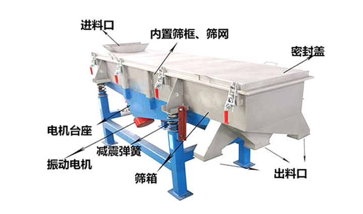 重型直線篩由篩箱、振動電機、減振系統及底架等組成。篩箱由篩框、篩板、襯板等組成。