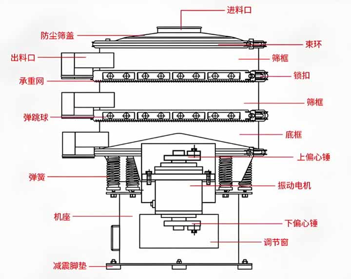圓篩機主要結(jié)構(gòu)由:篩框,振動電機,清網(wǎng)裝置,防塵蓋,束環(huán),彈簧等部件組成