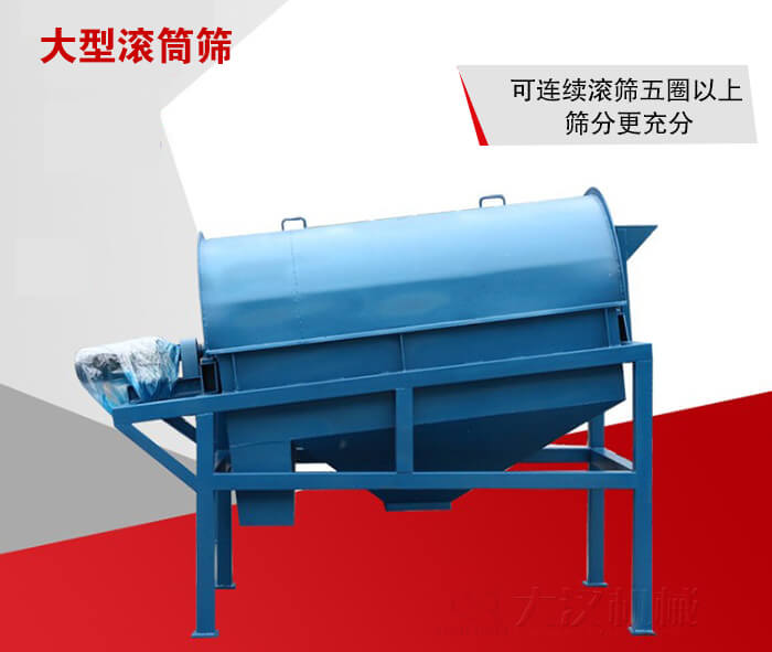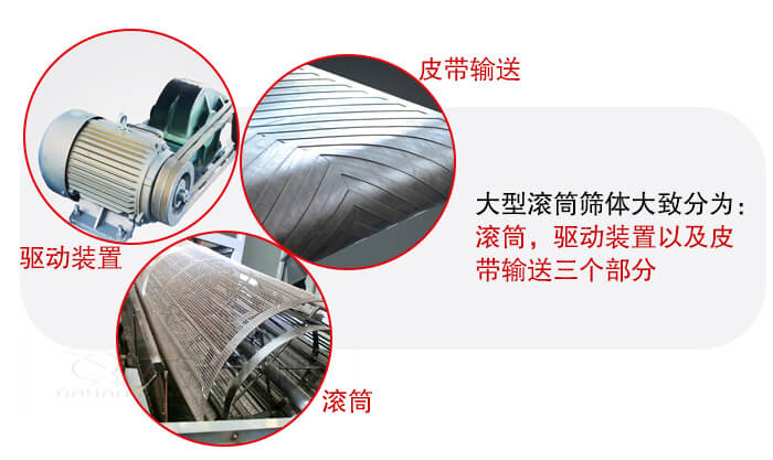 大型滾筒篩體大致分為:滾筒,驅動裝置以及皮帶輸送三個部分,產品的結構比較簡單,維修方便。