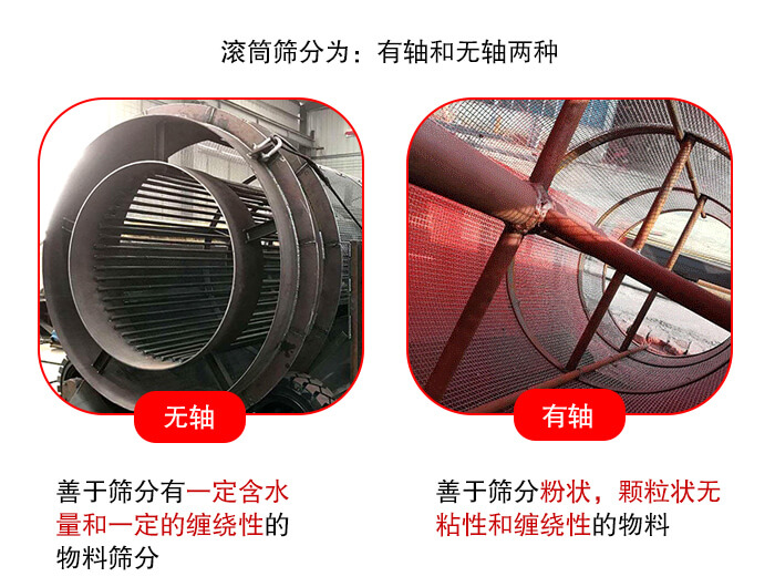 2,根據所篩分的物料選擇不同結構的產品,對于滾筒篩大致能夠分為:有軸和無軸兩種,有軸的善于篩分粉狀,顆粒狀無粘性和纏繞性的物料。無軸的則是和一些有一定含水量和一定的纏繞性的物料篩分。