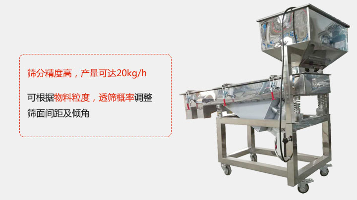 篩料機在工作時,物料在篩網的行程長,篩分精度高處理量大;產品可根據物料粒度,透篩概率生產率改變篩面間距及傾角;產品在篩分的同時,對物料短距離的輸送作用。