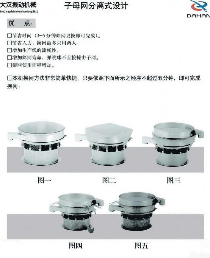 圓振動篩效率高、設計精巧耐用,粉類、粘液均可篩分; 換網容易、操作簡單、清洗方便; 網孔不堵塞、粉末不飛揚、可篩至400目或0.028mm;雜質、粗料自動排出,可以連續作業。